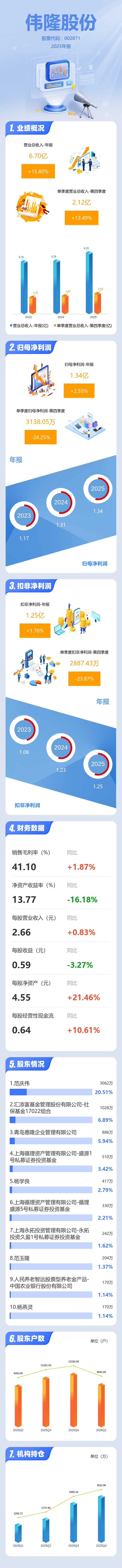 证券之星消息,伟隆股份2025年年报显示,当年度公司主营收入6.7亿元,同比上升15.8%;归母净利润1.34亿元,同比上升2.56%;扣非净利润1.25亿元,同比上升1.77%;其中2025年第四季度,公司单季度主营收入2.12亿元,同比上升13.5%;单季度归母净利润3138.05万元,同比下降24.26%;单季度扣非净利润2887.43万元,同比下降23.87%;负债率22.4%,投资收益735.12万元,财务费用312.35万元,毛利率41.1%。