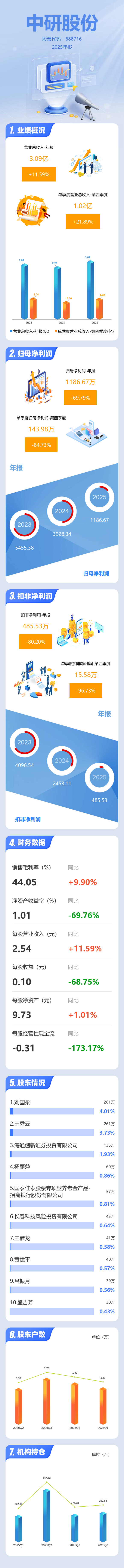 证券之星消息,中研股份2025年年报显示,当年度公司主营收入3.09亿元,同比上升11.6%;归母净利润1186.67万元,同比下降69.79%;扣非净利润485.53万元,同比下降80.21%;其中2025年第四季度,公司单季度主营收入1.02亿元,同比上升21.9%;单季度归母净利润143.98万元,同比下降84.73%;单季度扣非净利润15.58万元,同比下降96.73%;负债率11.52%,投资收益715.78万元,财务费用-8.59万元,毛利率44.05%。