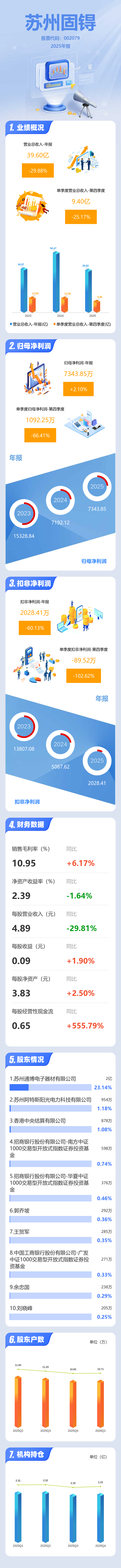 证券之星消息,苏州固锝2025年年报显示,当年度公司主营收入39.6亿元,同比下降29.88%;归母净利润7343.85万元,同比上升2.11%;扣非净利润2028.41万元,同比下降60.13%;其中2025年第四季度,公司单季度主营收入9.4亿元,同比下降25.18%;单季度归母净利润1092.25万元,同比下降66.42%;单季度扣非净利润-89.52万元,同比下降102.63%;负债率17.6%,投资收益176.57万元,财务费用922.38万元,毛利率10.95%。