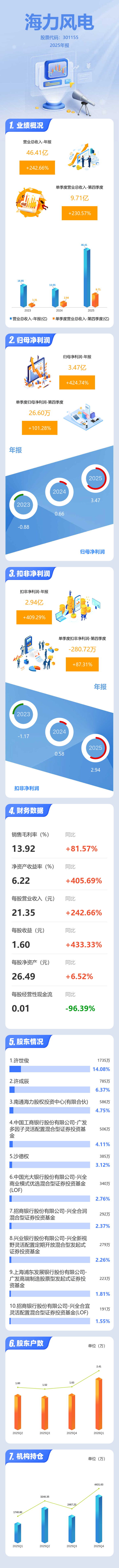 证券之星消息,海力风电2025年年报显示,当年度公司主营收入46.41亿元,同比上升242.66%;归母净利润3.47亿元,同比上升424.74%;扣非净利润2.94亿元,同比上升409.29%;其中2025年第四季度,公司单季度主营收入9.71亿元,同比上升230.57%;单季度归母净利润26.6万元,同比上升101.29%;单季度扣非净利润-280.72万元,同比上升87.32%;负债率38.12%,投资收益5861.91万元,财务费用3223.18万元,毛利率13.92%。