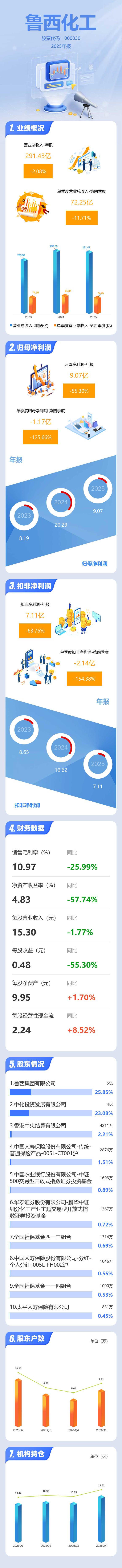 证券之星消息,鲁西化工2025年年报显示,当年度公司主营收入291.43亿元,同比下降2.08%;归母净利润9.07亿元,同比下降55.31%;扣非净利润7.11亿元,同比下降63.76%;其中2025年第四季度,公司单季度主营收入72.25亿元,同比下降11.71%;单季度归母净利润-1.17亿元,同比下降125.67%;单季度扣非净利润-2.14亿元,同比下降154.38%;负债率46.54%,投资收益-348.61万元,财务费用1.9亿元,毛利率10.97%。