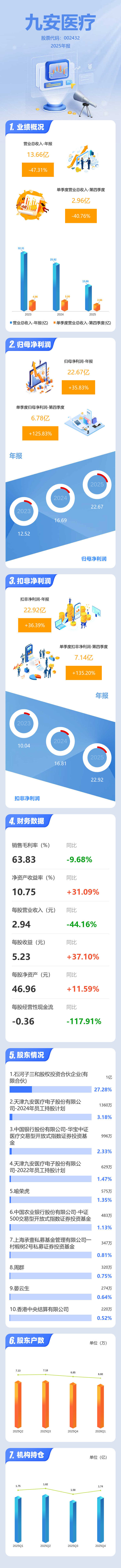 证券之星消息,九安医疗2025年年报显示,当年度公司主营收入13.66亿元,同比下降47.32%;归母净利润22.67亿元,同比上升35.84%;扣非净利润22.92亿元,同比上升36.39%;其中2025年第四季度,公司单季度主营收入2.96亿元,同比下降40.76%;单季度归母净利润6.78亿元,同比上升125.83%;单季度扣非净利润7.14亿元,同比上升135.21%;负债率24.82%,投资收益7.18亿元,财务费用-3180.66万元,毛利率63.83%。