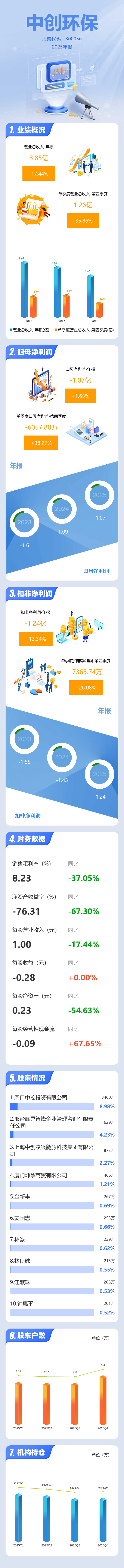 证券之星消息,中创环保2025年年报显示,当年度公司主营收入3.85亿元,同比下降17.44%;归母净利润-1.07亿元,同比上升1.65%;扣非净利润-1.24亿元,同比上升13.35%;其中2025年第四季度,公司单季度主营收入1.26亿元,同比下降35.87%;单季度归母净利润-6057.8万元,同比上升38.27%;单季度扣非净利润-7365.74万元,同比上升26.09%;负债率100.61%,投资收益819.81万元,财务费用1996.8万元,毛利率8.23%。