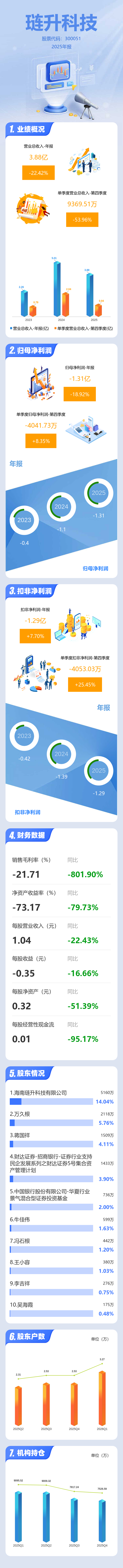 证券之星消息,琏升科技2025年年报显示,当年度公司主营收入3.88亿元,同比下降22.42%;归母净利润-1.31亿元,同比下降18.93%;扣非净利润-1.29亿元,同比上升7.7%;其中2025年第四季度,公司单季度主营收入9369.51万元,同比下降53.96%;单季度归母净利润-4041.73万元,同比上升8.36%;单季度扣非净利润-4053.03万元,同比上升25.46%;负债率80.99%,投资收益59.76万元,财务费用5000.14万元,毛利率-21.71%。