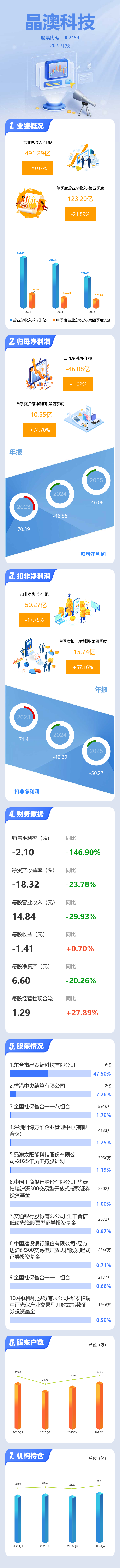 证券之星消息,晶澳科技2025年年报显示,当年度公司主营收入491.29亿元,同比下降29.94%;归母净利润-46.08亿元,同比上升1.02%;扣非净利润-50.27亿元,同比下降17.75%;其中2025年第四季度,公司单季度主营收入123.2亿元,同比下降21.89%;单季度归母净利润-10.55亿元,同比上升74.7%;单季度扣非净利润-15.74亿元,同比上升57.16%;负债率78.62%,投资收益-9910.25万元,财务费用4.01亿元,毛利率-2.1%。