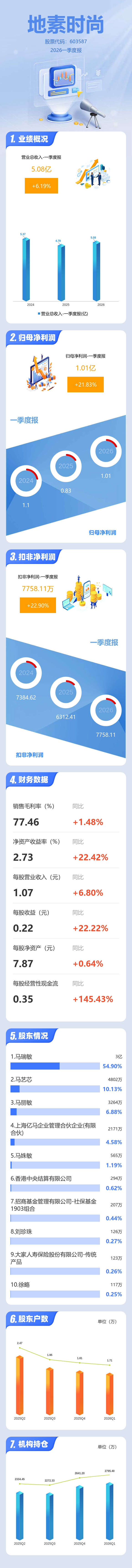 证券之星消息,地素时尚2026年一季报显示,一季度公司主营收入5.08亿元,同比上升6.2%;归母净利润1.01亿元,同比上升21.84%;扣非净利润7758.11万元,同比上升22.9%;负债率13.82%,投资收益70.05万元,财务费用-2703.37万元,毛利率77.46%。