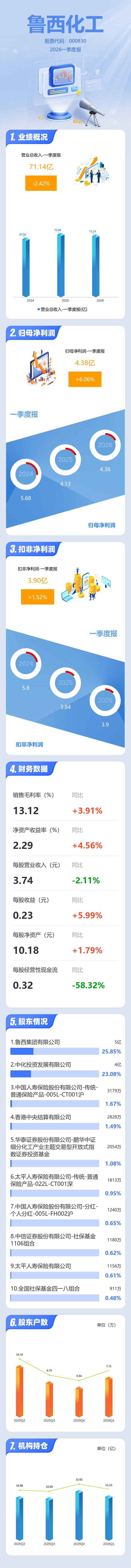 证券之星消息,鲁西化工2026年一季报显示,一季度公司主营收入71.14亿元,同比下降2.42%;归母净利润4.38亿元,同比上升6.07%;扣非净利润3.9亿元,同比上升1.53%;负债率45.64%,投资收益-15.52万元,财务费用5579.28万元,毛利率13.12%。