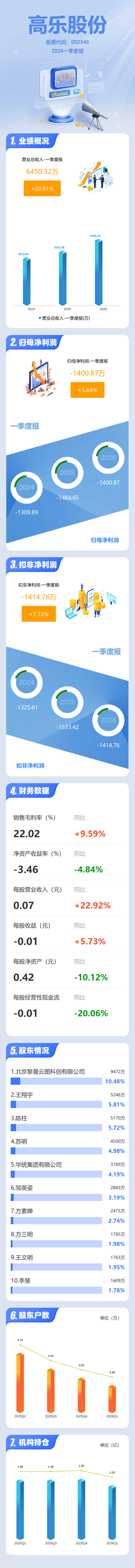 证券之星消息,高乐股份2026年一季报显示,一季度公司主营收入6450.32万元,同比上升22.82%;归母净利润-1400.87万元,同比上升5.64%;扣非净利润-1414.76万元,同比上升7.74%;负债率41.47%,财务费用408.87万元,毛利率22.02%。