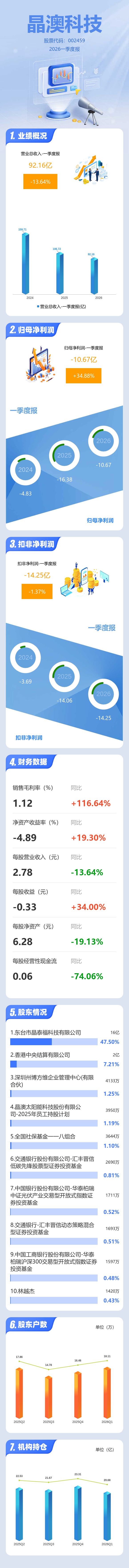 证券之星消息,晶澳科技2026年一季报显示,一季度公司主营收入92.16亿元,同比下降13.65%;归母净利润-10.67亿元,同比上升34.89%;扣非净利润-14.25亿元,同比下降1.37%;负债率79.07%,投资收益9751.01万元,财务费用5.49亿元,毛利率1.12%。
