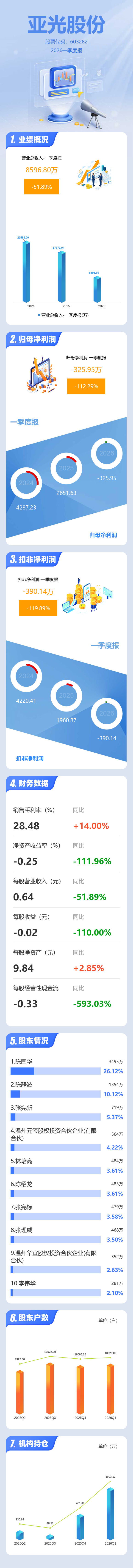 证券之星消息,亚光股份2026年一季报显示,一季度公司主营收入8596.8万元,同比下降51.9%;归母净利润-325.95万元,同比下降112.29%;扣非净利润-390.14万元,同比下降119.9%;负债率45.68%,投资收益35.96万元,财务费用-178.43万元,毛利率28.48%。