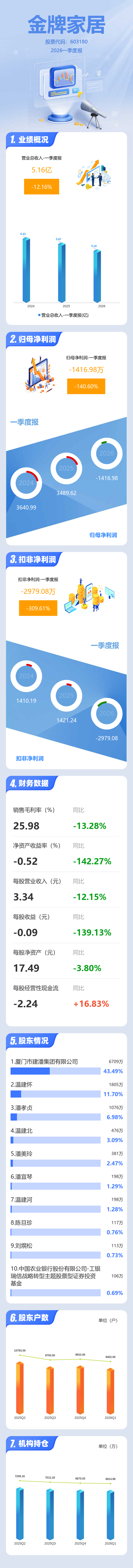 证券之星消息,金牌家居2026年一季报显示,一季度公司主营收入5.16亿元,同比下降12.16%;归母净利润-1416.98万元,同比下降140.61%;扣非净利润-2979.08万元,同比下降309.61%;负债率52.37%,投资收益669.21万元,财务费用373.69万元,毛利率25.98%。