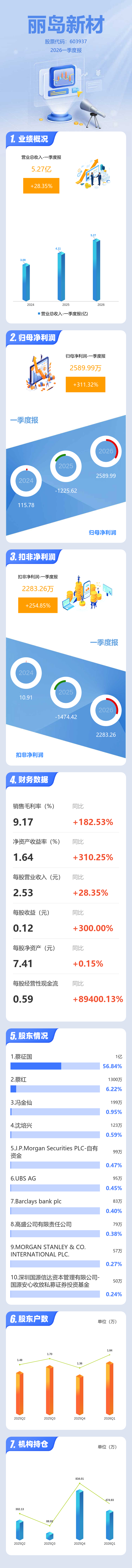 证券之星消息,丽岛新材2026年一季报显示,一季度公司主营收入5.27亿元,同比上升28.36%;归母净利润2589.99万元,同比上升311.32%;扣非净利润2283.26万元,同比上升254.86%;负债率40.07%,投资收益21.68万元,财务费用372.27万元,毛利率9.17%。