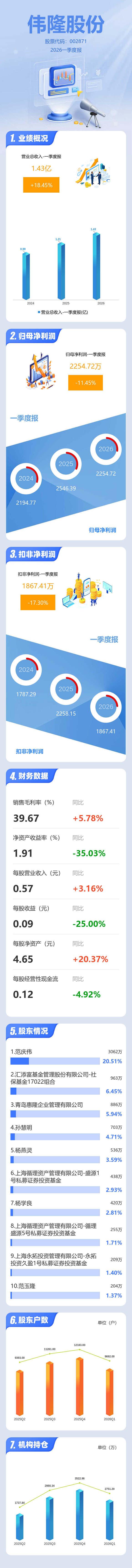 证券之星消息,伟隆股份2026年一季报显示,一季度公司主营收入1.43亿元,同比上升18.46%;归母净利润2254.72万元,同比下降11.45%;扣非净利润1867.41万元,同比下降17.3%;负债率18.98%,投资收益279.15万元,财务费用337.18万元,毛利率39.67%。
