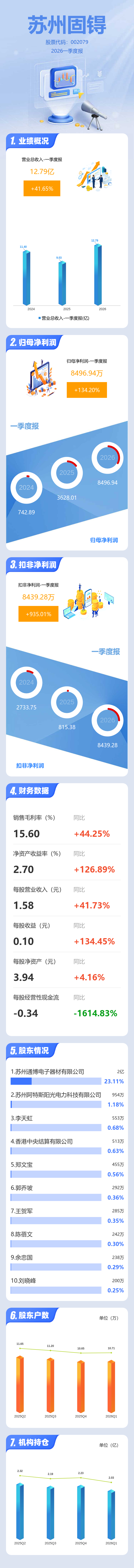 证券之星消息,苏州固锝2026年一季报显示,一季度公司主营收入12.79亿元,同比上升41.65%;归母净利润8496.94万元,同比上升134.2%;扣非净利润8439.28万元,同比上升935.01%;负债率17.95%,投资收益-292.3万元,财务费用613.78万元,毛利率15.6%。
