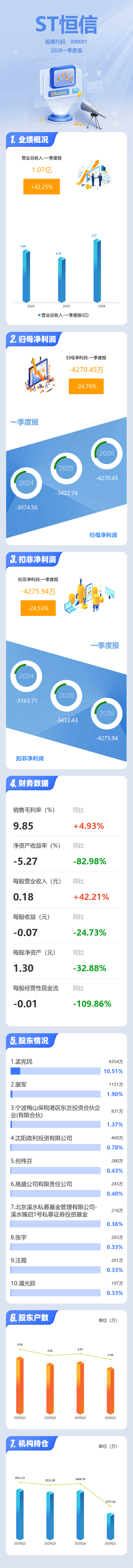 证券之星消息,ST恒信2026年一季报显示,一季度公司主营收入1.07亿元,同比上升42.26%;归母净利润-4270.45万元,同比下降24.77%;扣非净利润-4275.94万元,同比下降24.54%;负债率64.53%,投资收益-27.72万元,财务费用1399.68万元,毛利率9.85%。