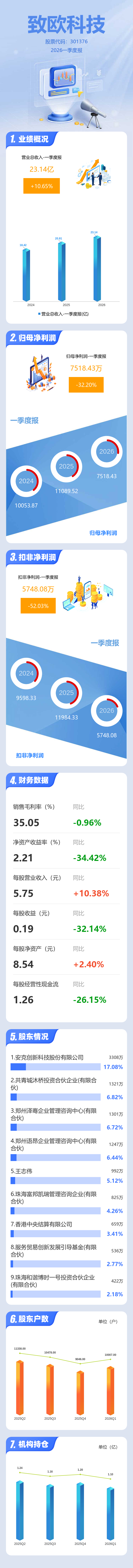 证券之星消息,致欧科技2026年一季报显示,一季度公司主营收入23.14亿元,同比上升10.66%;归母净利润7518.43万元,同比下降32.2%;扣非净利润5748.08万元,同比下降52.04%;负债率51.12%,投资收益1089.1万元,财务费用7821.23万元,毛利率35.05%。