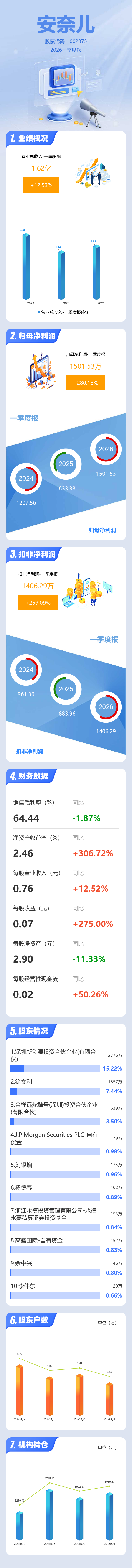 证券之星消息,安奈儿2026年一季报显示,一季度公司主营收入1.62亿元,同比上升12.53%;归母净利润1501.53万元,同比上升280.18%;扣非净利润1406.29万元,同比上升259.09%;负债率37.84%,投资收益13.79万元,财务费用112.35万元,毛利率64.44%。