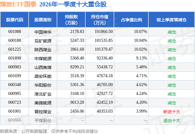 煤炭ETF国泰基金成立于2020年1月20日,基金经理为吴中昊,基金跟踪标的为中证煤炭指数,成立以来超额回报为103.96%,近一个月超额回报为-0.05%。最新披露的基金持仓数据显示,截止2026年3月31日,该基金第一大重仓股为中国神华(601088),持股占比为10.07%。