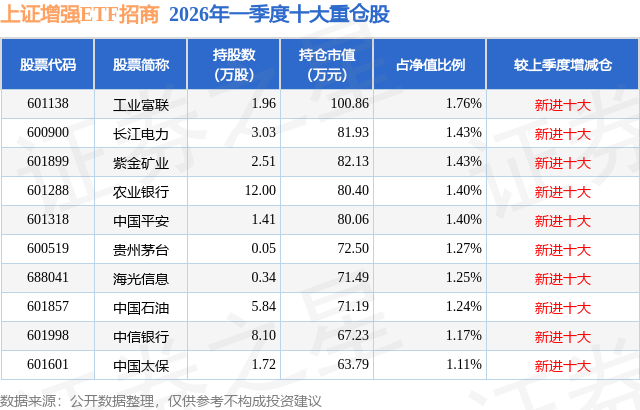上证增强ETF招商基金成立于2025年12月25日,基金经理为王宁远,基金跟踪标的为上证综合指数,成立以来超额回报为-0.16%,近一个月超额回报为0.84%。最新披露的基金持仓数据显示,截止2026年3月31日,该基金第一大重仓股为工业富联(601138),持股占比为1.76%。