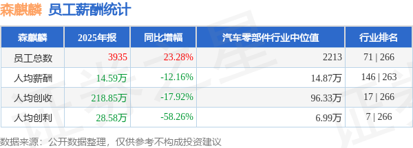 证券之星消息,4月29日森麒麟公布2025年年报,当年营收86.12亿元,同比增1.19%;净利润为11.25亿元,同比减48.54%。根据财报数据披露,当年公司员工总数3935人,同比增23.28%;人均薪酬14.59万元,同比减12.16%;人均创收218.85万元,同比减17.92%;人均创利28.58万元,同比减58.26%;公司员工薪酬统计见下表: