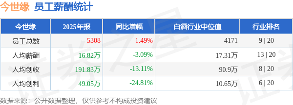 证券之星消息,4月29日今世缘公布2025年年报,当年营收101.82亿元,同比减11.81%;净利润为26.04亿元,同比减23.69%。根据财报数据披露,当年公司员工总数5308人,同比增1.49%;人均薪酬16.82万元,同比减3.09%;人均创收191.83万元,同比减13.11%;人均创利49.05万元,同比减24.81%;公司员工薪酬统计见下表: