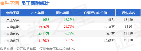 证券之星消息,4月29日金种子酒公布2025年年报,当年营收7.22亿元,同比减21.96%;净利润为-1.99亿元,同比增22.91%。根据财报数据披露,当年公司员工总数1688人,同比减16.27%;人均薪酬19.36万元,同比增26.76%;人均创收42.77万元,同比减6.79%;公司员工薪酬统计见下表: