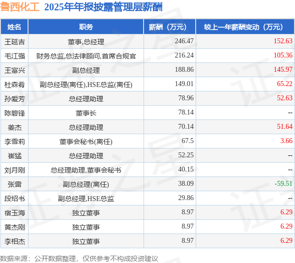 证券之星消息,鲁西化工发布2025年年报,数据显示:公司主营收入291.43亿元,同比减2.08%。归母净利润为9.07亿元,同比减55.31%。扣非净利润为7.11亿元,同比减63.76%。当年公司员工总数12121人,同比减0.02%。人均薪酬20.88万元(注:"人均薪酬"根据定期报告中"应付职工薪酬"附注的本期增加值 / 员工总数计算而来),同比减1.08%。人均创收240.44万元,同比减2.06%。人均创利7.49万元,同比减55.27%。其中管理层薪酬总额为1282.58万元,同比上一年增18.91%,薪酬最高的为董事,总经理王延吉,薪酬246.47万元。