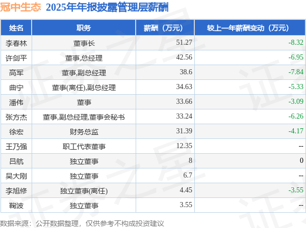 证券之星消息,冠中生态发布2025年年报,数据显示:公司主营收入1.54亿元,同比增6.2%。归母净利润为-5114.99万元,同比增27.86%。扣非净利润为-5928.98万元,同比增24.17%。当年公司员工总数247人,同比减13.64%。人均薪酬16.84万元(注:"人均薪酬"根据定期报告中"应付职工薪酬"附注的本期增加值 / 员工总数计算而来),同比减6.99%。人均创收62.47万元,同比增22.97%。其中管理层薪酬总额为300.4万元,同比上一年减23.04%,薪酬最高的为董事长李春林,薪酬51.27万元。