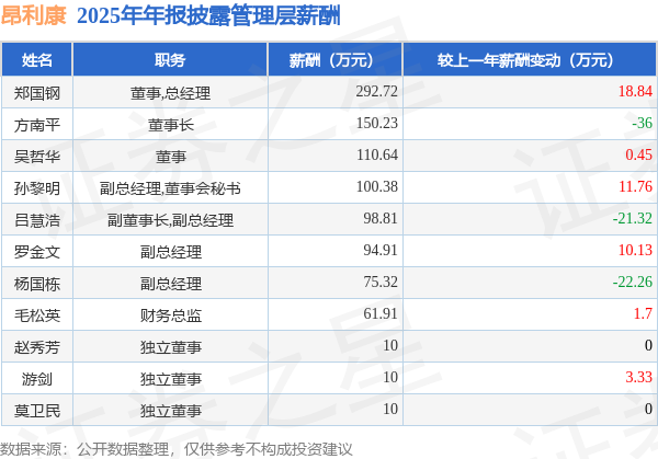 证券之星消息,昂利康发布2025年年报,数据显示:公司主营收入14.25亿元,同比减7.35%。归母净利润为1.25亿元,同比增56.15%。扣非净利润为8655.71万元,同比增78.82%。当年公司员工总数1236人,同比减3.06%。人均薪酬15.82万元(注:"人均薪酬"根据定期报告中"应付职工薪酬"附注的本期增加值 / 员工总数计算而来),同比增0.24%。人均创收115.28万元,同比减4.43%。人均创利12.68万元,同比增6.44%。其中管理层薪酬总额为1014.92万元,同比上一年减9.67%,薪酬最高的为董事,总经理郑国钢,薪酬292.72万元。