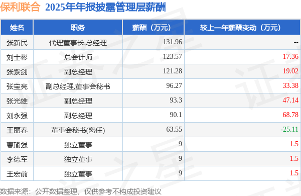 证券之星消息,保利联合发布2025年年报,数据显示:公司主营收入66.91亿元,同比增2.84%。归母净利润为-8.49亿元,同比减2331.7%。扣非净利润为-8.85亿元,同比减1023.67%。当年公司员工总数7236人,同比减2.49%。人均薪酬14.3万元(注:"人均薪酬"根据定期报告中"应付职工薪酬"附注的本期增加值 / 员工总数计算而来),同比增2.1%。人均创收92.46万元,同比增6.08%。其中管理层薪酬总额为747.03万元,同比上一年减6.69%,薪酬最高的为代理董事长,总经理张新民,薪酬131.96万元。