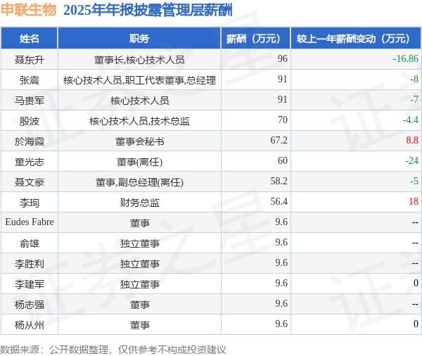 证券之星消息,申联生物发布2025年年报,数据显示:公司主营收入2.88亿元,同比减4.99%。归母净利润为-2049.5万元,同比增54.19%。扣非净利润为-2598.46万元,同比增46.29%。当年公司员工总数375人,同比减4.09%。人均薪酬20.76万元(注:"人均薪酬"根据定期报告中"应付职工薪酬"附注的本期增加值 / 员工总数计算而来),同比减7.43%。人均创收76.87万元,同比减0.94%。其中管理层薪酬总额为647.4万元,同比上一年减21.89%,薪酬最高的为董事长,核心技术人员聂东升,薪酬96.0万元。