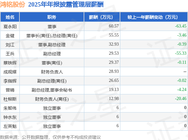 证券之星消息,鸿铭股份发布2025年年报,数据显示:公司主营收入1.77亿元,同比减12.01%。归母净利润为-1836.06万元,同比减87.91%。扣非净利润为-2355.49万元,同比减60.99%。当年公司员工总数382人,同比减8.17%。人均薪酬15.11万元(注:"人均薪酬"根据定期报告中"应付职工薪酬"附注的本期增加值 / 员工总数计算而来),同比减7.06%。人均创收46.38万元,同比减4.18%。其中管理层薪酬总额为313.64万元,同比上一年减33.62%,薪酬最高的为董事夏永阳,薪酬60.57万元。