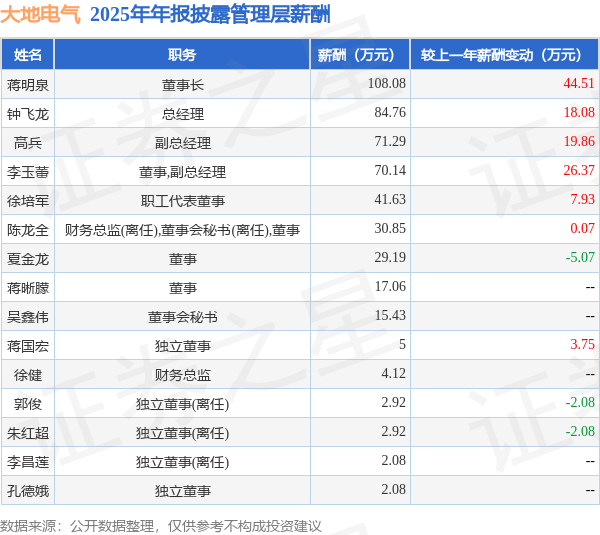 证券之星消息,大地电气发布2025年年报,数据显示:公司主营收入17.15亿元,同比增114.47%。归母净利润为-979.55万元,同比增82.81%。扣非净利润为-1701.23万元,同比增71.56%。当年公司员工总数3295人,同比增69.15%。人均薪酬13.19万元(注:"人均薪酬"根据定期报告中"应付职工薪酬"附注的本期增加值 / 员工总数计算而来),同比增0.19%。人均创收52.04万元,同比增26.8%。其中管理层薪酬总额为487.55万元,同比上一年增35.11%,薪酬最高的为董事长蒋明泉,薪酬108.08万元。