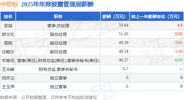 证券之星消息,中纺标发布2025年年报,数据显示:公司主营收入1.94亿元,同比减4.33%。归母净利润为2153.81万元,同比减26.6%。扣非净利润为1663.8万元,同比减35.25%。当年公司员工总数527人,同比增0.57%。人均薪酬19.48万元(注:"人均薪酬"根据定期报告中"应付职工薪酬"附注的本期增加值 / 员工总数计算而来),同比增0.63%。人均创收36.82万元,同比减4.87%。人均创利4.25万元,同比减18.51%。其中管理层薪酬总额为274.1万元,同比上一年减3.19%,薪酬最高的为董事,总经理李斌,薪酬59.84万元。