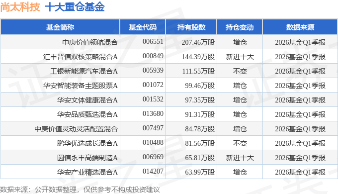 持有尚太科技最多的基金为中庚价值领航混合,目前规模为50.2亿元,最新净值3.8737(4月28日),较上一交易日上涨0.35%,近一年上涨63.08%。该基金现任基金经理为刘晟。
