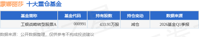 持有蒙娜丽莎最多的基金为工银战略转型股票A,目前规模为12.43亿元,最新净值3.45(4月28日),较上一交易日上涨0.79%,近一年上涨2.25%。该基金现任基金经理为杜洋。