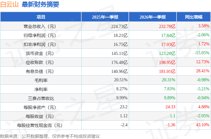 据证券之星公开数据整理,近期白云山(600332)发布2026年一季报。根据财报显示,白云山增收不增利。截至本报告期末,公司营业总收入232.78亿元,同比上升3.58%,归母净利润17.84亿元,同比下降2.06%。按单季度数据看,第一季度营业总收入232.78亿元,同比上升3.58%,第一季度归母净利润17.84亿元,同比下降2.06%。
