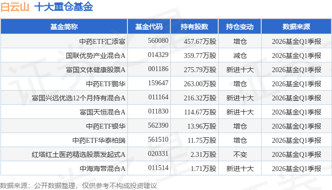 持有白云山最多的基金为中药ETF汇添富,目前规模为25.1亿元,最新净值0.992(4月28日),较上一交易日上涨0.64%,近一年下跌2.79%。该基金现任基金经理为过蓓蓓。