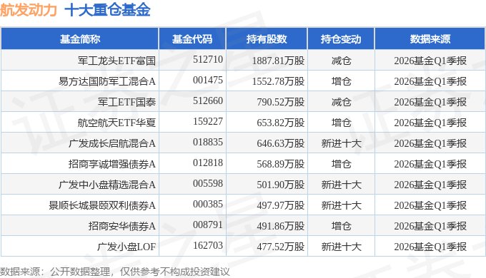 持有航发动力最多的基金为军工龙头ETF富国,目前规模为95.77亿元,最新净值0.7521(4月28日),较上一交易日下跌3.09%,近一年上涨29.23%。该基金现任基金经理为王乐乐 牛志冬。