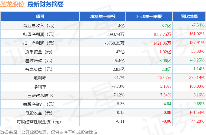 据证券之星公开数据整理,近期圣龙股份(603178)发布2026年一季报。截至本报告期末,公司营业总收入3.7亿元,同比下降7.54%,归母净利润1887.75万元,同比上升161.02%。按单季度数据看,第一季度营业总收入3.7亿元,同比下降7.54%,第一季度归母净利润1887.75万元,同比上升161.02%。本报告期圣龙股份盈利能力上升,毛利率同比增幅375.19%,净利率同比增幅166%。