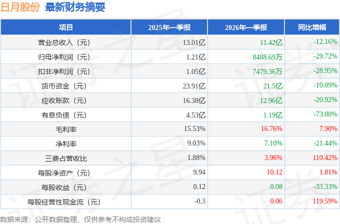 据证券之星公开数据整理,近期日月股份(603218)发布2026年一季报。截至本报告期末,公司营业总收入11.42亿元,同比下降12.16%,归母净利润8488.69万元,同比下降29.72%。按单季度数据看,第一季度营业总收入11.42亿元,同比下降12.16%,第一季度归母净利润8488.69万元,同比下降29.72%。本报告期日月股份公司应收账款体量较大,当期应收账款占最新年报归母净利润比达234.14%。