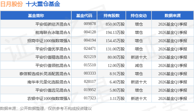 持有日月股份最多的基金为平安低碳经济混合A,目前规模为10.54亿元,最新净值1.2193(4月28日),较上一交易日下跌1.43%,近一年上涨23.82%。该基金现任基金经理为何杰。