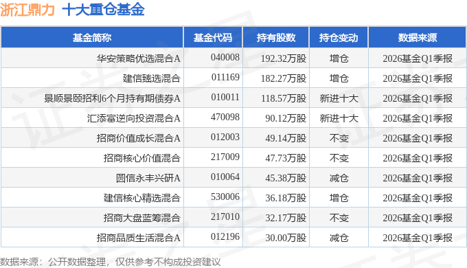 持有浙江鼎力最多的基金为华安策略优选混合A,目前规模为30.43亿元,最新净值2.2801(4月28日),较上一交易日上涨1.27%,近一年上涨42.83%。该基金现任基金经理为杨明。