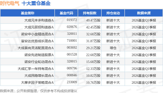 持有时代电气最多的基金为大成元丰多利债券A,目前规模为18.15亿元,最新净值1.1326(4月28日),较上一交易日上涨0.0%,近一年上涨4.94%。该基金现任基金经理为孙丹。