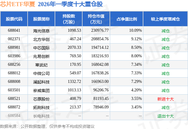 芯片ETF华夏基金成立于2020年1月20日,基金经理为赵宗庭,基金跟踪标的为国证半导体芯片指数,成立以来超额回报为-9.64%,近一个月超额回报为-0.02%。最新披露的基金持仓数据显示,截止2026年3月31日,该基金第一大重仓股为海光信息(688041),持股占比为10.09%。