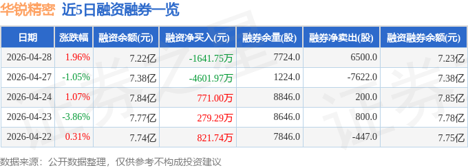 华锐精密融资融券信息显示,融资方面,当日融资买入4734.74万元,融资偿还6376.49万元,融资净偿还1641.75万元。融券方面,融券卖出6500.0股,融券偿还0.0股,融券余量7724.0股,融券余额92.89万元。融资融券余额7.23亿元。