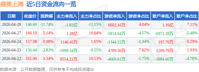 证券之星消息,截至2026年4月28日收盘,盛美上海(688082)报收于146.6元,下跌11.74%,换手率2.33%,成交量11.06万手,成交额16.36亿元。