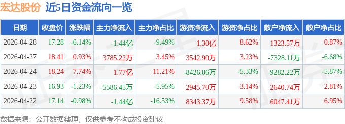 证券之星消息,截至2026年4月28日收盘,宏达股份(600331)报收于17.28元,下跌6.14%,换手率4.25%,成交量86.28万手,成交额15.13亿元。