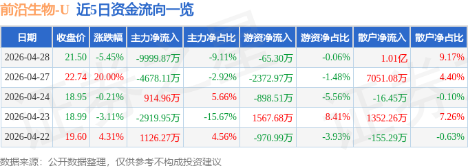 证券之星消息,截至2026年4月28日收盘,前沿生物(688221)报收于21.5元,下跌5.45%,换手率13.25%,成交量49.63万手,成交额10.97亿元。