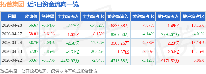 证券之星消息,截至2026年4月28日收盘,拓普集团(601689)报收于56.67元,下跌3.64%,换手率1.47%,成交量25.56万手,成交额14.64亿元。